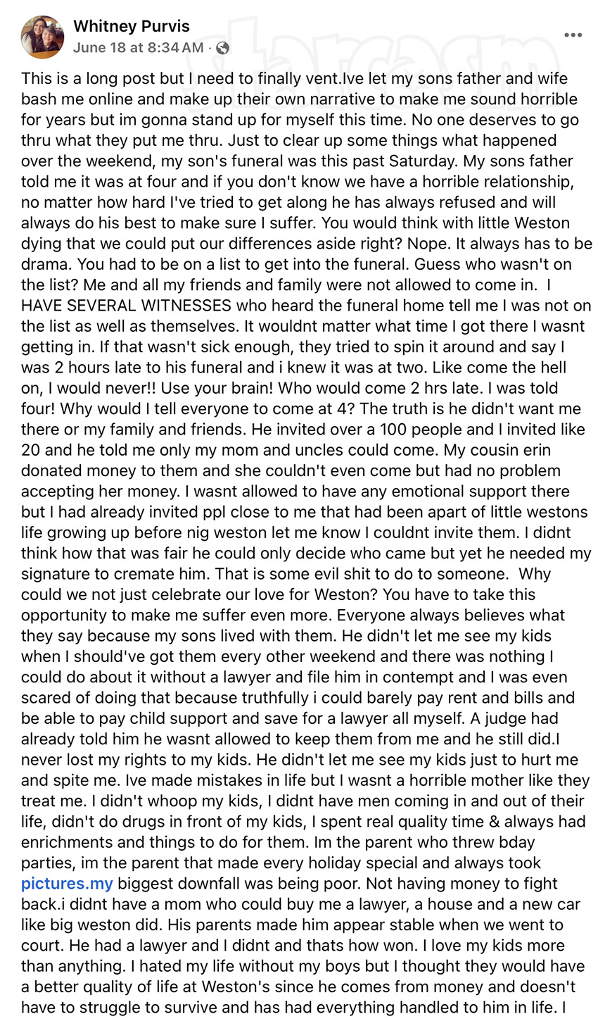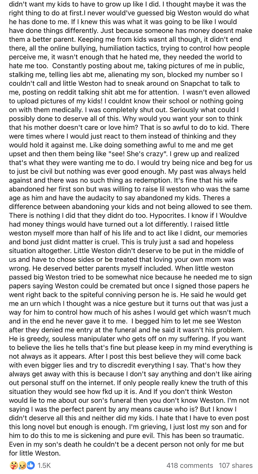I’m not saying I was the perfect parent by any means cause who is? But I know I didn’t deserve all this and neither did my kids. I hate that I have to even post this long novel but enough is enough. I’m grieving, I just lost my son and for him to do this to me is sickening and pure evil. This has been so traumatic. Even in my son’s death he couldn’t be a decent person not only for me but for little Weston.