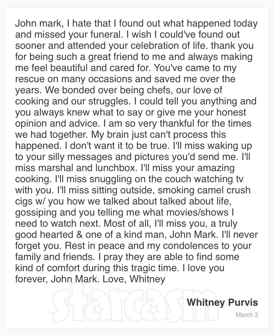 “John mark, I hate that I found out what happened today and missed your funeral,” Whitney’s post begins. “I wish I could’ve found out sooner and attended your celebration of life.”