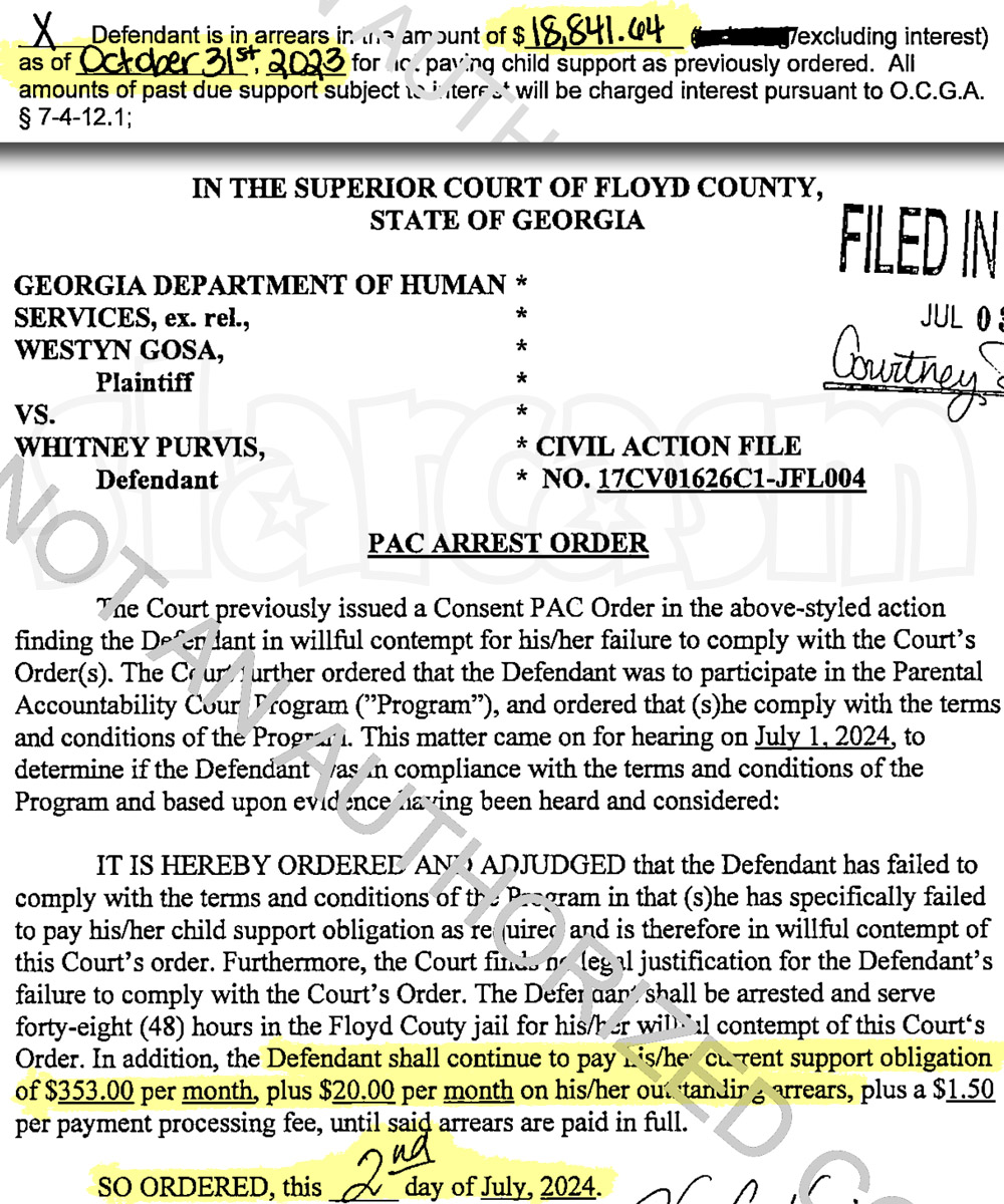 The judge in the case made it official the following day by issuing an Arrest Order sentencing Whitney to 48 hours in jail. In addition to the jail time, Whitney was ordered to continue making her $353 a month child support payment, plus and extra $20 a month that will go towards what she owes.