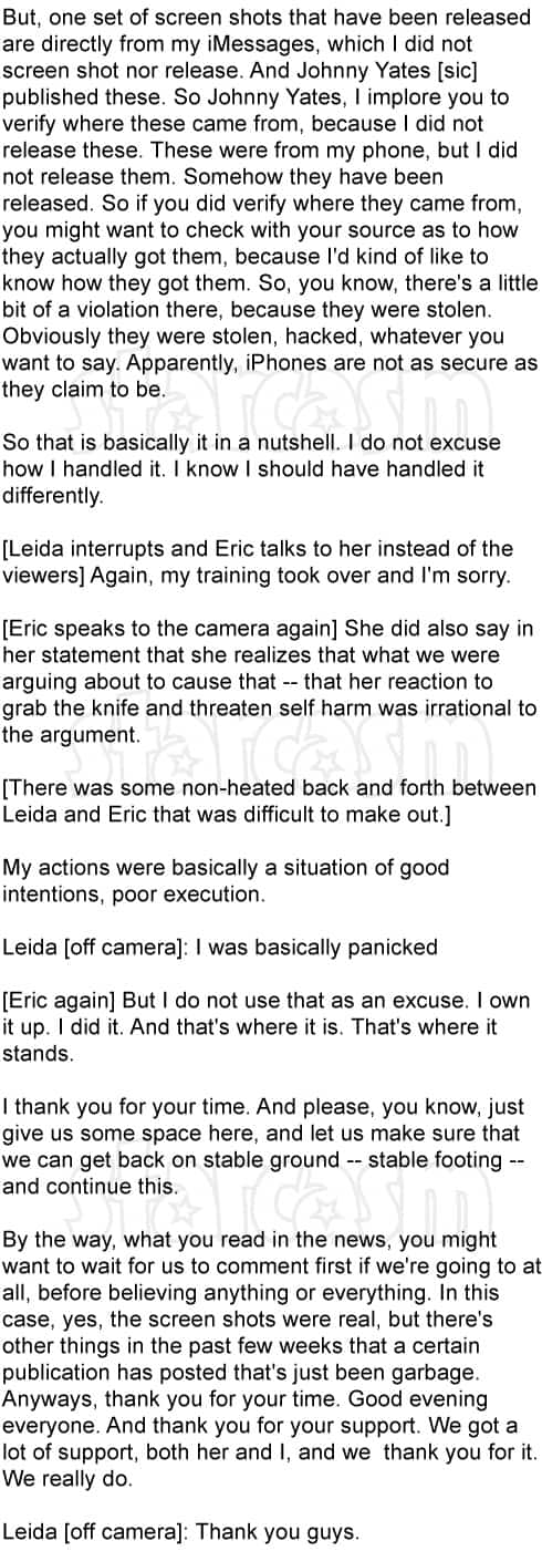 Later in the video, Eric addresses the “leaked” text messages and confirms that they are completely legit. However, he says that one of the conversations was screen capped from his iPhone, and he did not do it. He is completely baffled how someone was able to screen shot that conversation.