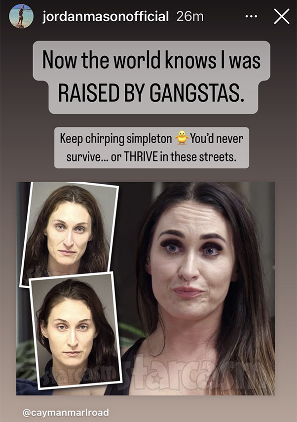 UPDATE – Cayman Islands news outlet Cayman Marl Road picked up on our story about Jordan’s felony arrest, and it has sparked a bit of a feud on Instagram. @JordanMasonOfficial and @caymanmarlroad have been going back and forth, including this story post from Jordan stating she was “raised by gangstas:”