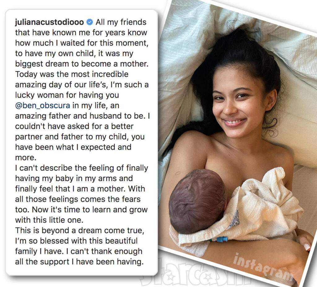 Juliana reveals that her son’s full name is Benjamin James Louis Custodio and he was born today, July 19. He weighed 4.280kg (9.4 pounds) and measured 55cm (21.6535 inches). Benjamin was delivered via vaginal birth with no epidural.