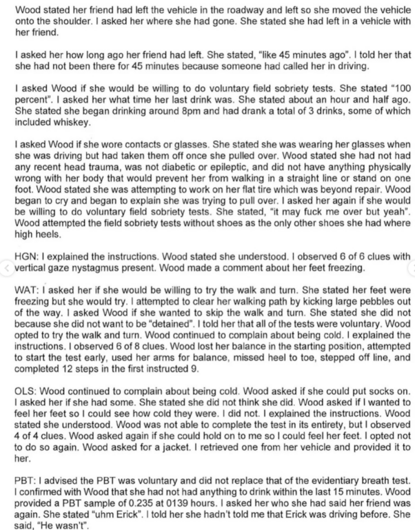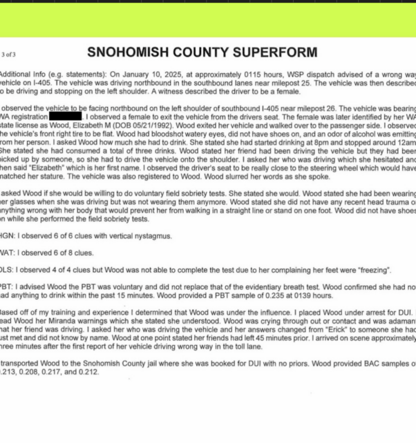 The details listed in the Reddit comment stating that she was pulled over for driving on the wrong side of the road and had a blood alcohol level three times over the legal limit are corroborated by the police report.