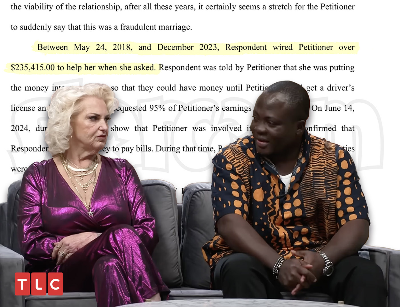 “Between May 24, 2018, and December 2023, Respondent [Michael] wired Petitioner [Angela] over $235,415.00 to help her when she asked,” the motion states. “Respondent was told by Petitioner that she was putting the money into an account so that they could have money until Petitioner could get a driver’s license and a job. Petitioner requested 95% of Petitioner’s earnings from the show.”
