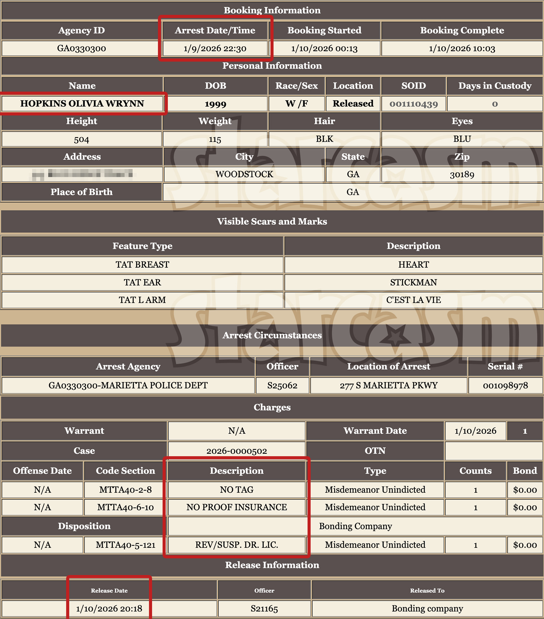 Olivia Hopkins mug shot photo: Cobb County Sheriff’s Office / Georgia Gazette