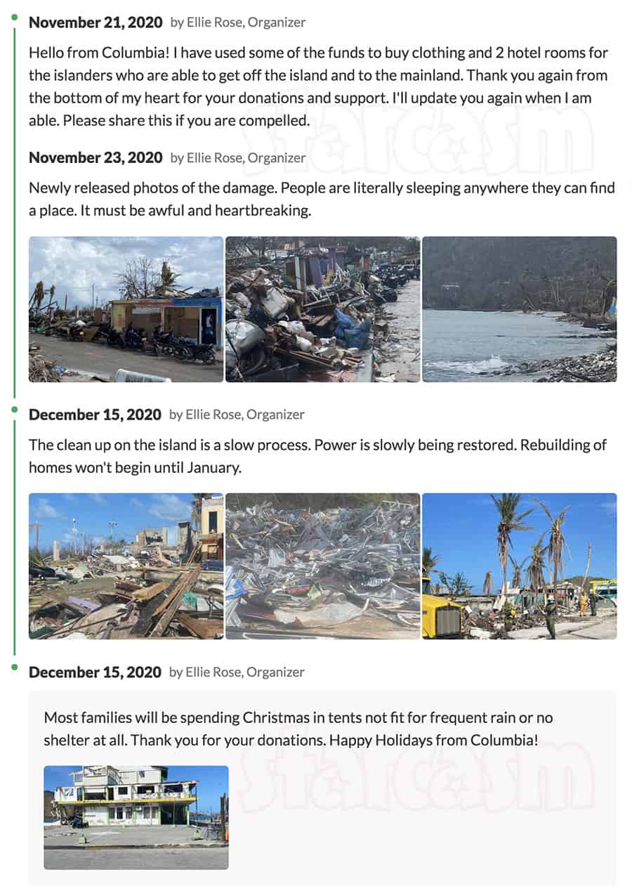 The campaign’s description reveals something about the timeline of Ellie’s return to the island, which lines up with her bio. Hurricane Iota hit Providencia on November 17. Ellie starts the GoFundMe campaign the following day and reveals that she plans to leave to return to Colombia on November 19 — two days after the storm hit.