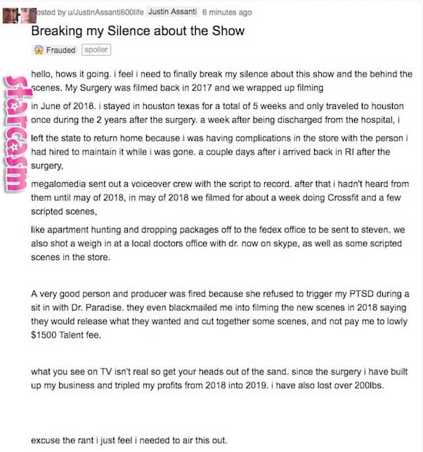 Justin shared the post on Reddit, where he’s a regular contributor. Entitled “Breaking my Silence about the Show,” the post was only active for a few hours, but it’s still accessible via archived versions of the page. In his post, Justin explains the method behind he and Steven’s upcoming Assanti Brothers update, which will be the fourth chapter of their My 600 Lb Life story. (Technically, their 2017 debut counts as two installments, as the show considers the double episode “Part 1” and “Part 2.” Their first Where Are They Now? episode aired in January of 2018.)