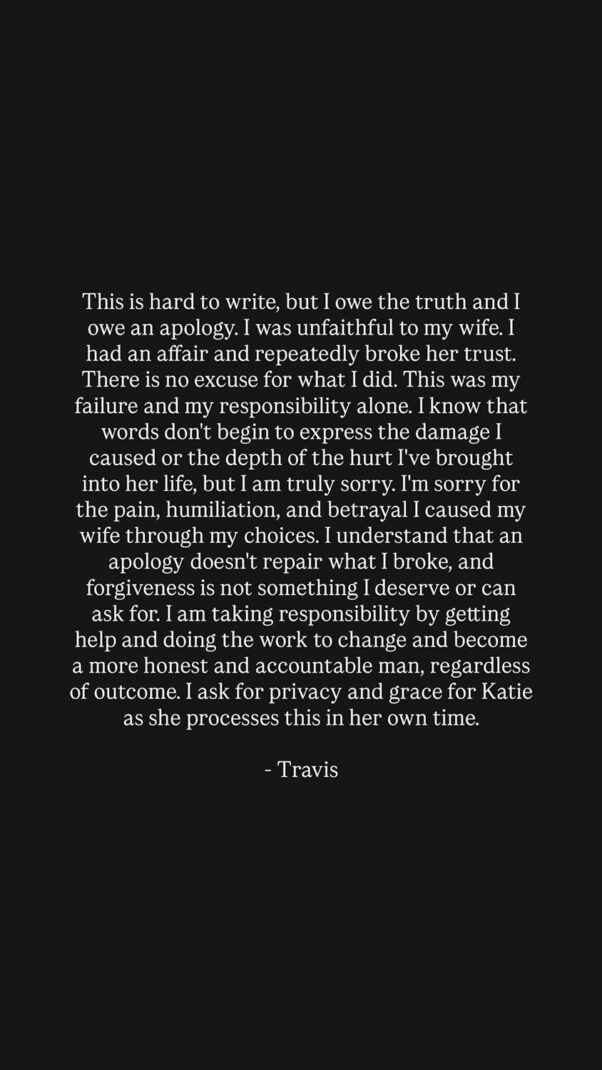 Travis concluded his statement by asking for “privacy and grace for Katie as she processes this in her own time”—a request that acknowledges she now faces the dual trauma of pregnancy loss and marital betrayal simultaneously.