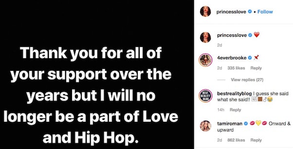 With that said, here’s Princess Love’s official statement on the matter, which she made via Instagram. (We’ve screencapped the post instead of embedding it in case it gets deleted in the near future, which seems likely.)