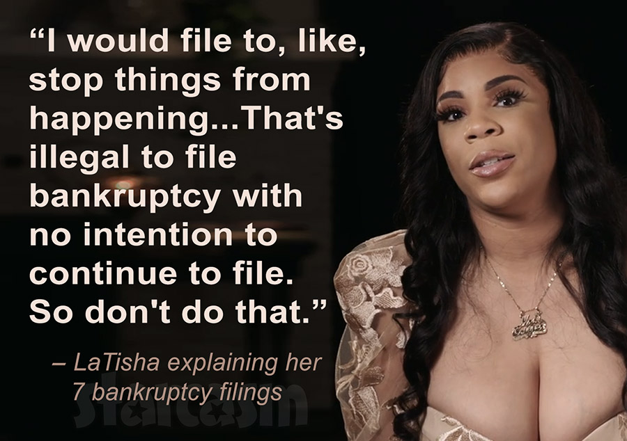 The fact that bankruptcy filings can delay debt collection should not be new information to Starcasm readers. Love During Lockup’s LaTisha Collier admitted in an interview that was a big reason she personally filed for bankruptcy 7 times.