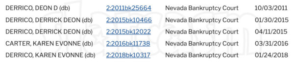 Derrick Deon Derrico filed for Chapter 13 bankruptcy in Nevada on April 11, 2015. Derrick stated he had liabilities of $600,009.53. (In his previous filings, Deon/Derrick didn’t include specifics about his liabilities.) Deon filed a motion to dismiss the bankruptcy case on February 11, 2016, and the case was dismissed the following day.