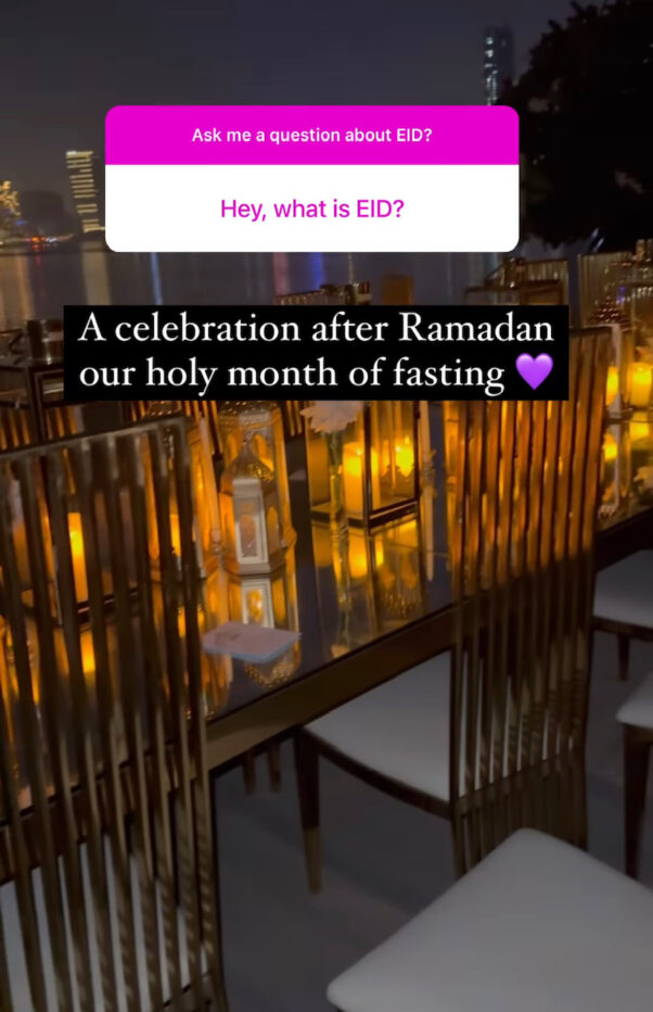 Against the backdrop of her gorgeous tablescape, we learn that after Ramadan, the holy month of fasting, Muslims get together and eat A LOT of food (very understandable.)