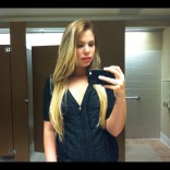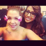 Above is a look at the first finished image from Kailyn Lowry’s shoot – a striking black-and-white shot of Kail busting out of her shirt with “BEAUTY IS SIZELESS” written in large black letters on her side. But don’t think the entire shoot was devoid of color! Check out this behind-the-scenes photo of Kailyn rocking a bright blue Betsey Johnson dress with some serious floral eye accents: