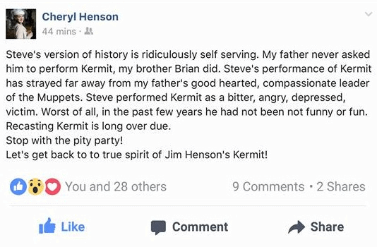In a Facebook post Cheryl says Steve’s portrayal of Kermit had strayed very far from her father’s characterization, and that the modern Kermit had become a “bitter, angry, depressed victim.”