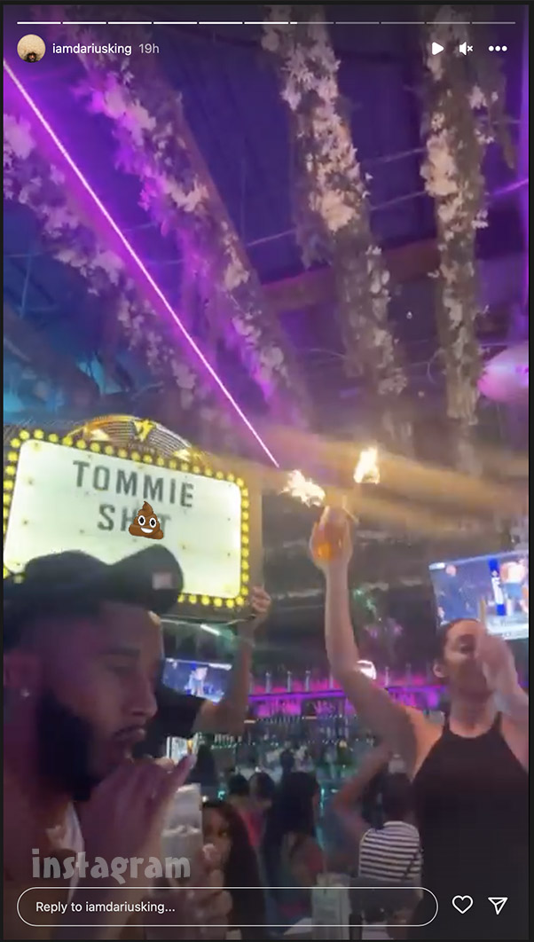 There are several Instagram posts showing Tommie out on the town Saturday night, including videos posted by @alexjairus at Victory Lounge. The clips show Victory staff holding up a marquee sign that reads “TOMMIE SH*T” along with waitresses dancing with sparklers. I am not a frequenter of clubs, but I believe this means Tommie and her crew paid for bottle service?