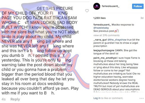 After the news broke, new LHHH cast member Alexis Skyy–best known for her relationship with Masika’s baby daddy Fetty Wap–and returnee Hazel E reportedly refused to film their scenes later that day. Hazel also took to Instagram with a since-deleted post to call Masika a “low life” with “priorities all the way fuqqed up.” Which was apparently the last straw for Masika, who responded like this: