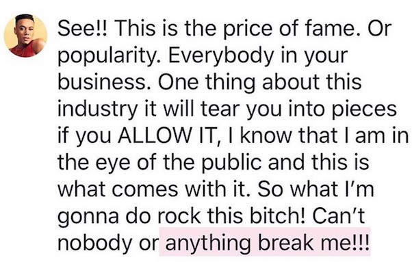 See!! This is the price of fame. Or popularity. Everybody in your business. One thing about this industry it will tear you into pieces if you ALLOW IT, I know that I am in the eye of the public and this is what comes with it. So what I’m gonna do rock this bitch! Can’t nobody or anything break me!!!