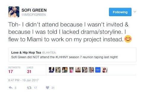 However, it also looks like one new cast member’s time with the show might have come to a close. Reports that Sofi Green wasn’t at the reunion have since been confirmed by Sofi herself, who said she was working on new music down Miami way while the taping took place. That doesn’t necessarily mean Sofi won’t be coming back for LHHNY Season 8–but she also didn’t sound too disappointed by the prospect on Twitter:
