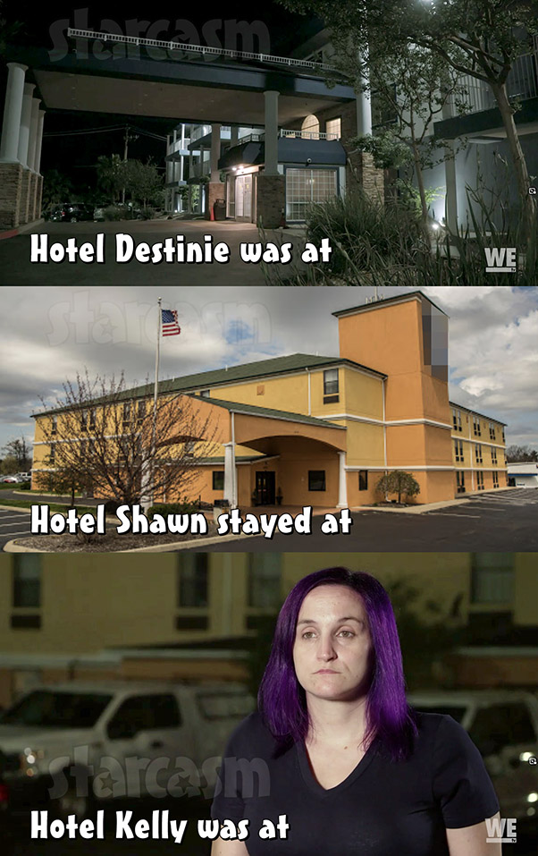 The exterior scenes with Destinie show a completely different hotel. Meanwhile, Kelly looks to be standing in front of Shawn’s actual hotel during her parking lot interview: