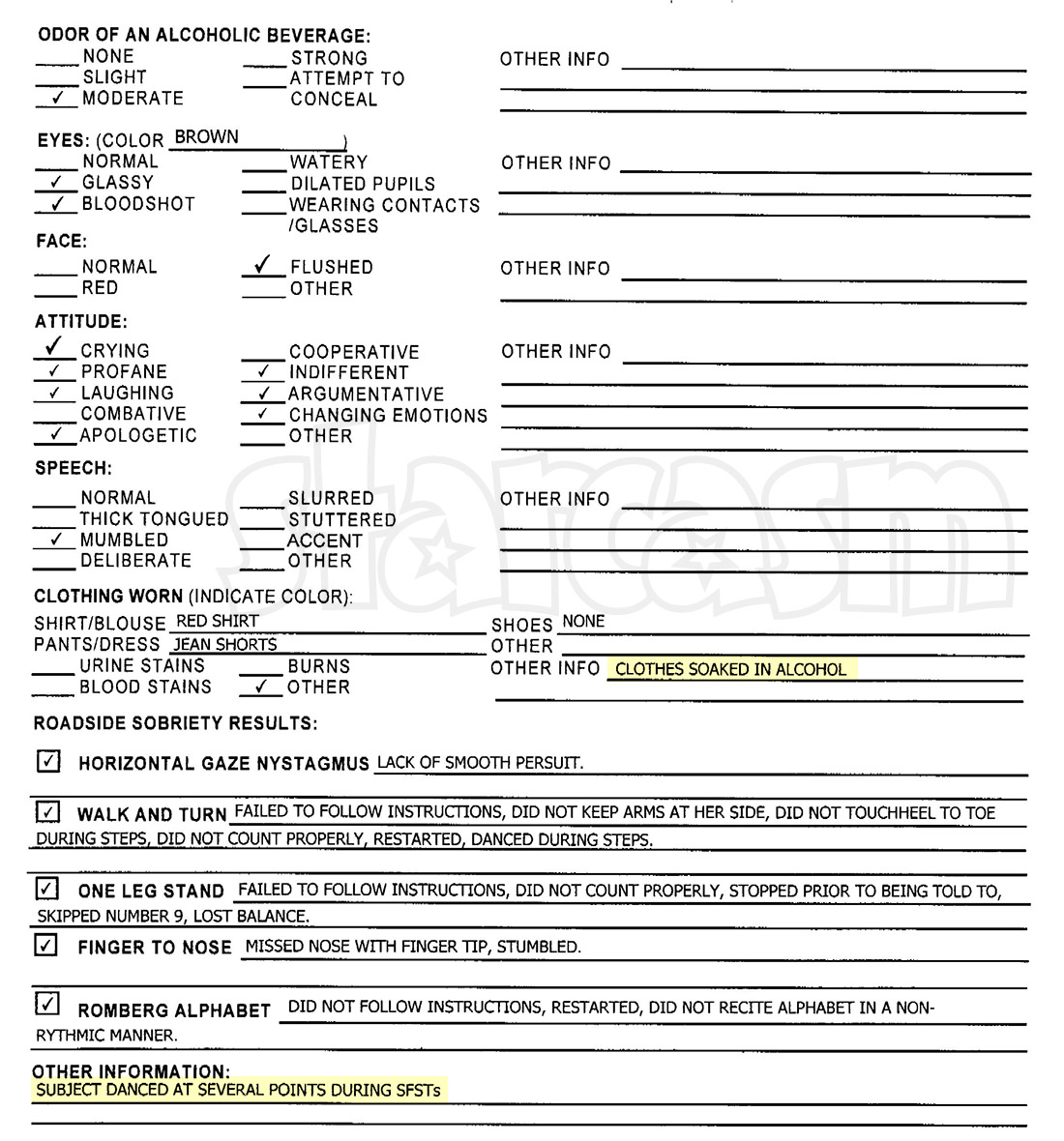 Ashley’s clothes were reportedly “soaked in alcohol,” and she failed a series of field sobriety tests. However, it appears Ashley failed the tests with a bit of flair as the officer indicates in the report that she “danced at several points.”