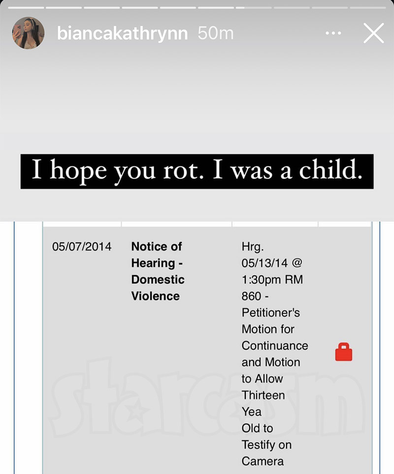 Bianca also shared a screen cap of what appears to be a 2014 court case involving domestic violence: