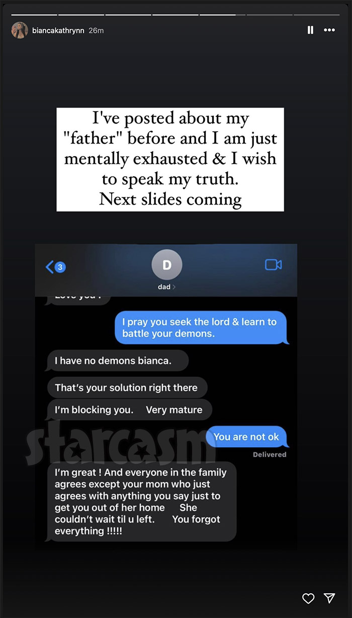 In September, Bianca brought up her dad again on Instagram. She posted the screen capped text message exchange below in her stories: