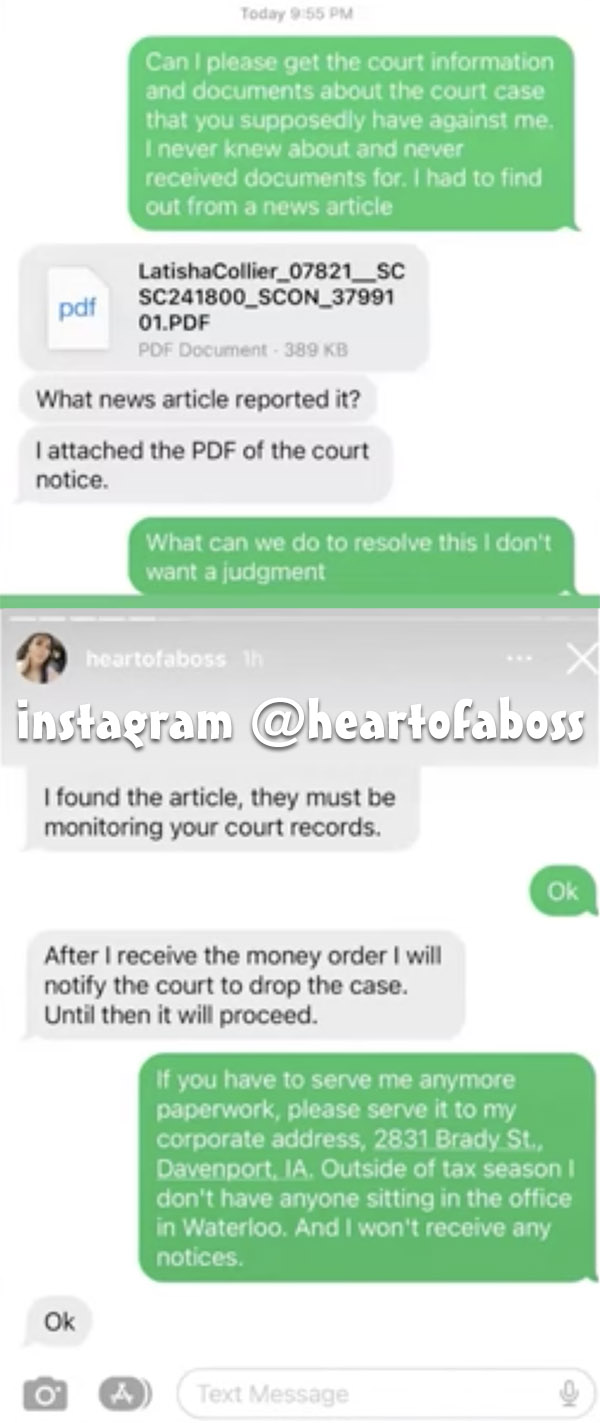 LaTisha then posted a series of screen capped text messages that look to be between her and the landlord for her Waterloo office. In the text exchange, she admits she didn’t know about the lawsuit and that she had to find out from a news article. “What can we do to resolve this? I don’t want a judgment,” LaTisha wrote.