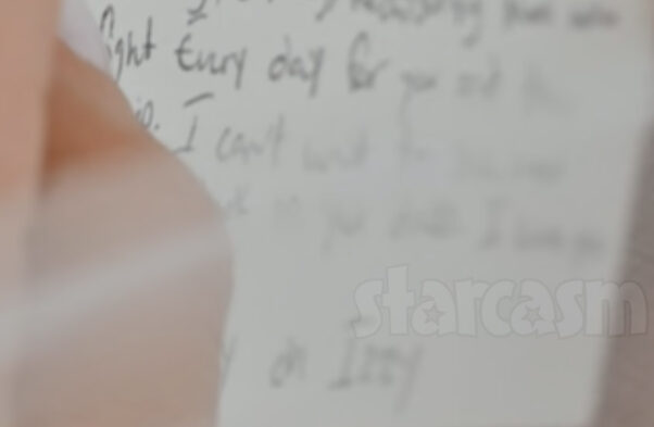 Unfortunately, in the footage of the letter itself, that sentence is a bit blurry and behind Stacy’s veil. It’s also partially obscured by her hand.