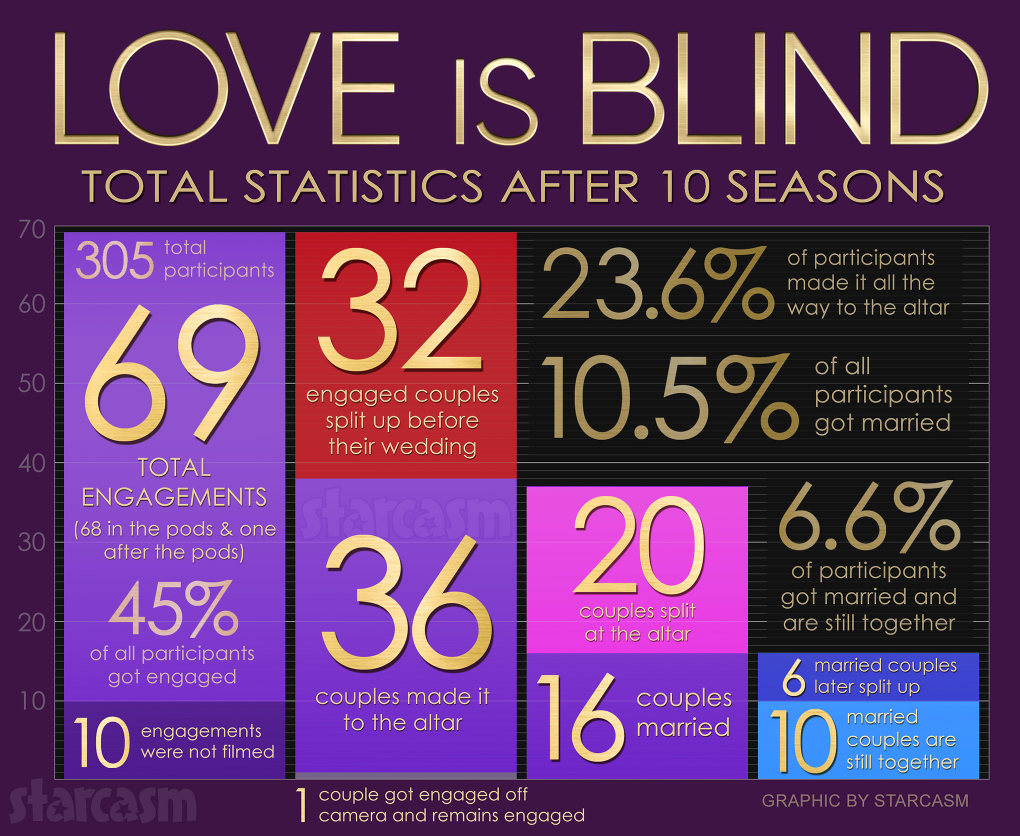 In the graphic above you can see the statistics for all ten seasons of Love Is Blind. Once again, we went on the assumption that both Season 10 couples who got married are still together. We won’t know for sure about that until after the Reunion airs.