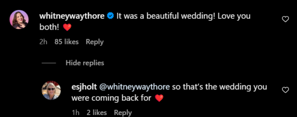 Despite all this, Whitney was there for her bestie. In the comments section of his IG post announcing his wedding, Thore commented, seemingly confirming she showed up: