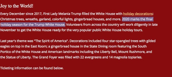 “Note to Readers,” the new text reads. “Joe Biden won the election which makes this the final holiday season for the Trump White House. This is not the official White House website as noted in the footer below.”