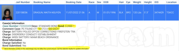 Nikita still being behind bars is a bit surprising given that her bail has been set at just $2,000, according to the Miami-Dade County Corrections and Rehabilitation website. However, the bond amount is followed by a couple of asterisks with the following note: “Bond information posted on this case/charge may not reflect the current amount. Call the detention facility for updated information.” TMZ reports that Nikita was booked “on $5,000 bond.”