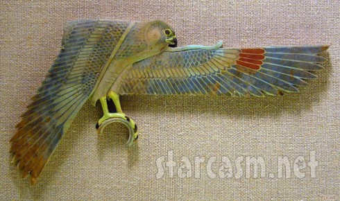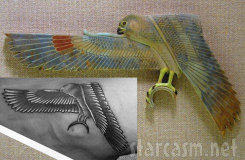 I’d say the chances are pretty darned good that Rihanna’s Egyptian falcon tattoo was inspired by this particular piece! (The similarity to a handgun appears to be mere coincidence, unless there is something to that Stargate movie after all.) Here are some more details about the original piece of Egyptian art: