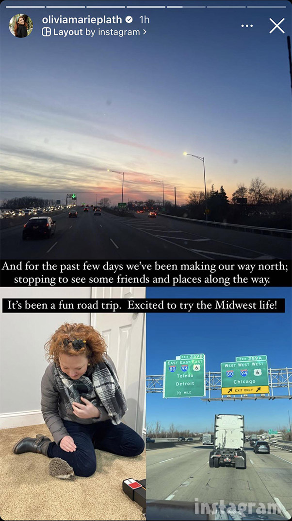 On Wednesday, Olivia shared an update from the road in her Instagram stories. She posted a montage that included a photo traveling north on Interstate 65 in northern Indiana just before intersecting with Interstates 94 and 80.