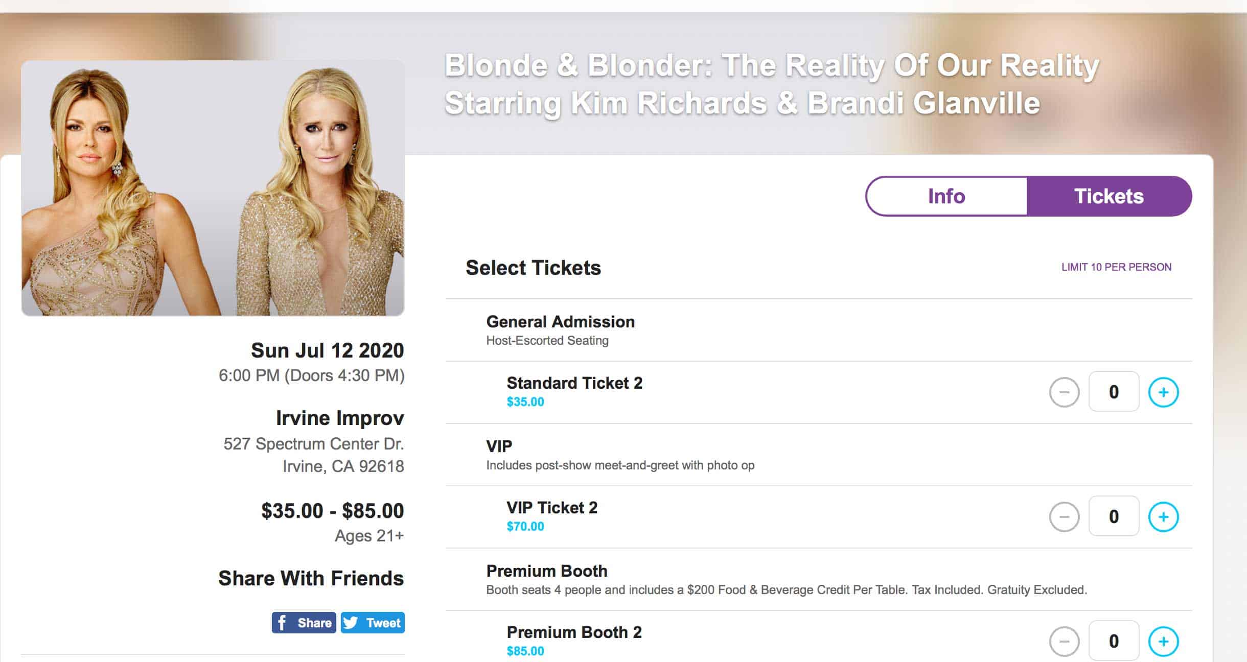 55-year-old Kim has a live show with Brandi Glanville called Blonde and Blonder: The Reality of Our Lives scheduled for this summer! The planned date is Sun July 12,2020 at Irvine Improv in Irvine, California. It’s a 21+ age show with ticket prices ranging from $35.00 – $85.00.