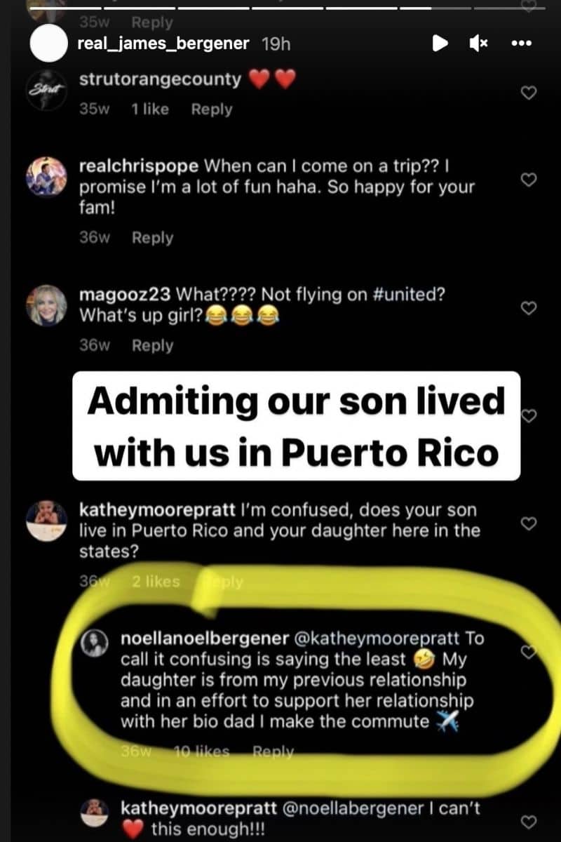 Another highlighted comment is a reply to a question asking if her son lives in Puerto Rico and her daughter lives in California. She replies with: “My daughter is from my previous relationship and in an effort to support her relationship with her bio dad I make the commute.” This does seem to imply that she is settled in Puerto Rico and only “commutes” to California to give her daughter visits with her dad.