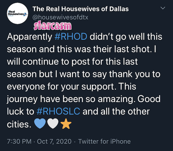 “Apparently #RHOD didn’t go well this season,” the account wrote, “and this was their last shot. I will continue to post for this last season but I want to say thank you to everyone for your support. This journey have been so amazing. Good luck to #RHOSLC and all the other cities.”