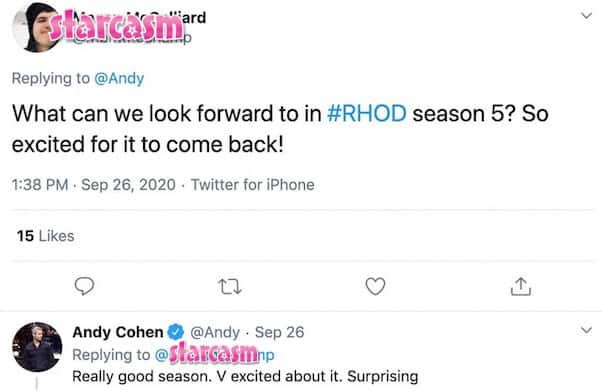 In an exchange with a RHOD fan, Andy called the upcoming season “really good,” adding it was “surprising” and he was “v excited about it.” That endorsement, combined with the belief that the first trailer will most likely drop about a month from now, appears to have re-ignited fans’ excitement.