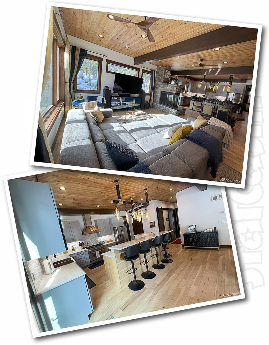 The large rock see-through fireplace, situated in the open kitchen, dining and great room area, adds warmth and charm. Tongue & groove wood, along with beam accents, adorn the 10′ ceilings, while large windows provide abundant natural light and views of the Collegiate Peaks. The kitchen opens to an entertainment-ready patio kitchen area with smoker grill.