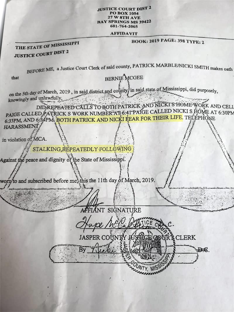 Second, we have a purported affidavit by Patrick Marble and Nicki Smith accusing Bernie and Paige of repeatedly calling them at home and at work. According to the affidavit, which was signed on March 11, Bernie McGee “did repeated calls to both Patrick and Nicki’s home, work, and cell.” The document continues by stating that “Paige called Patrick’s work number at 6:41, Paige called Nicki’s home at 6:30PM, 6:33PM, and 6:34PM” on March 5.