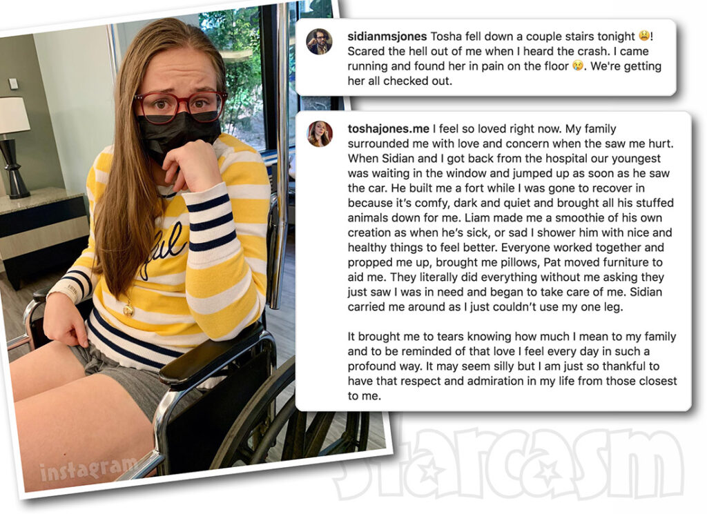 Speaking of Sidian, he shared the same photo of Tosha in a wheelchair on Instagram. “Tosha fell down a couple stairs tonight 😫!” he wrote. “Scared the hell out of me when I heard the crash. I came running and found her in pain on the floor 😢. We’re getting her all checked out.”