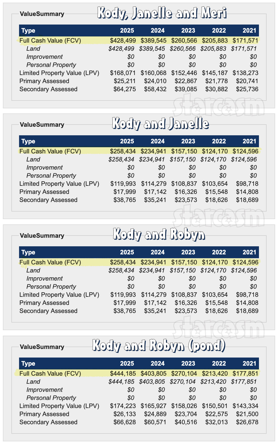 Based on the 2025 full cash value of the properties, Coyote Pass is currently worth $1,389,552. That is roughly $570,000 more than the Browns paid in 2018.