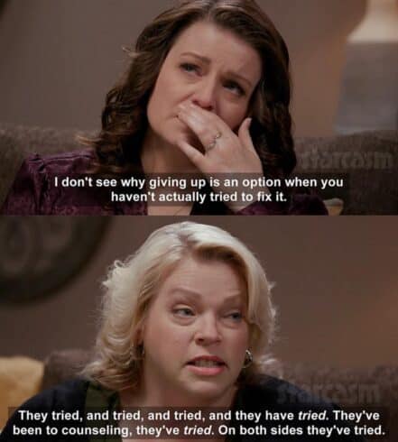 Meanwhile, Janelle says that Christine and Kody have, in fact, tried. She feels this word fits so much she used it at least six times She says they “tried, and tried, and tried, and they have tried. They’ve been to counseling. They’ve tried. On both sides, they’ve tried, and I think it just got to the point where they just realized it didn’t work anymore.”