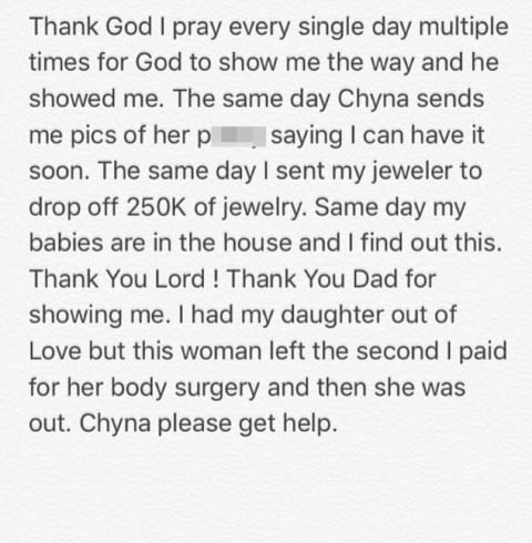 "Just sad. Loved Chyna as my wife & accepted all the wrong she did and continued to ride for her and remain Loyal to her. Never did I cheat"
