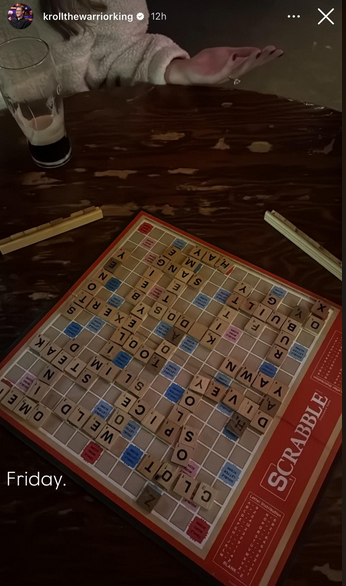Posted to his Instagram story on the night of February 21st, 2025, Kroll eluded to playing Scrabble on a cozy night in. The post is simply captioned ‘Friday.’ What makes this newsworthy? Well, Reddit immediately noticed that the woman he is playing the game with has a HUGE diamond ring on THAT finger…