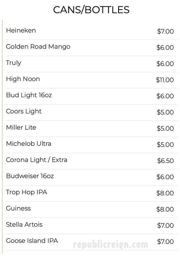 As you might imagine with a super swanky restaurant and club, Republic’s drink menu offers several opportunities to drop some SERIOUS coin! You can go the low brow route with a $5 bottle of Michelob Ultra, or you can loosen the Chanel purse strings and splurge for a $700 bottle of Don Julio 1942 tequila!