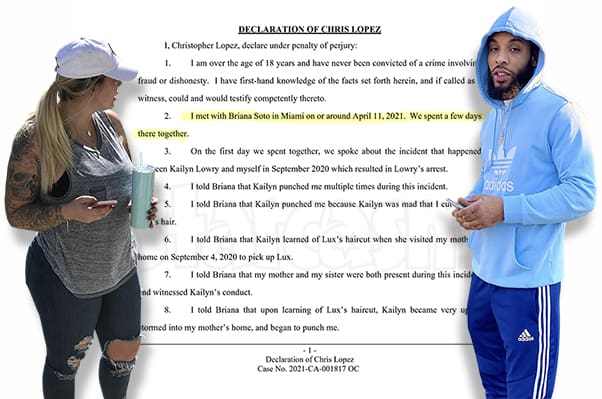 There was a Notice of Filing Supplemental Evidence filed by Briana’s attorney on November 24. The “supplemental evidence” is a two-page affidavit from Chris Lopez confirming that he told Briana that Kail broke into his mother’s house and hit him. Chris says he spent a few days with Briana in Miami in April of this year, and that is when he told her the information about the incident with Kail.