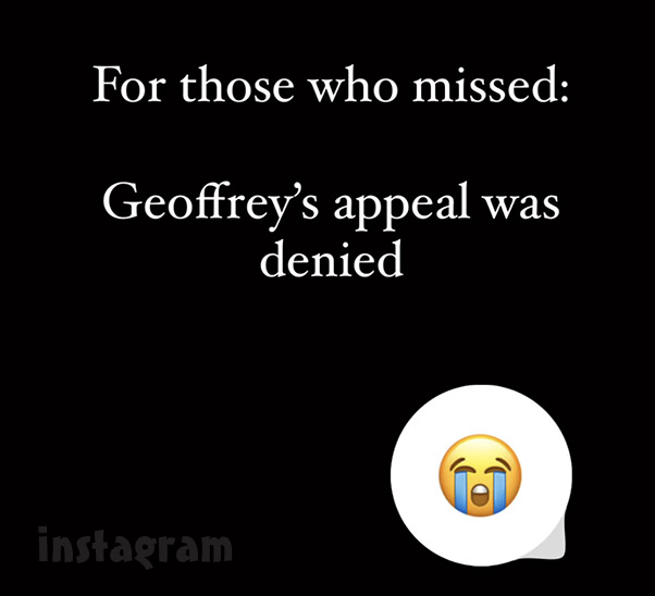 “You know the devastating news: Geoffrey’s appeal was denied,” Varya captioned a video of herself laughing and having fun in Helen, Georgia. “I’m heartbroken,” she added, along with the 😔 and 💔 emoji.
